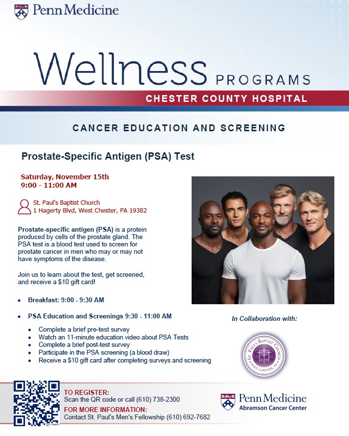 MEN: SIGN UP TODAY! Click on the event title above, scan the QR code on the flyer, or call (610) 738-2300.